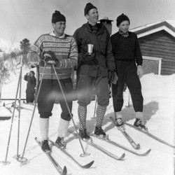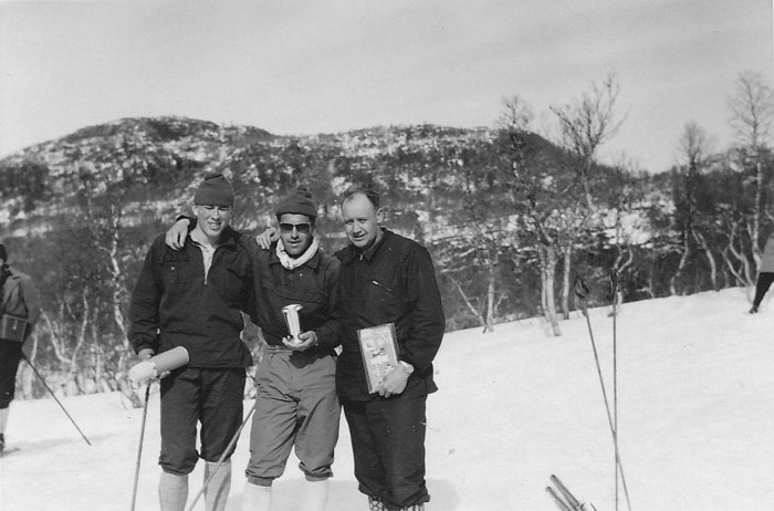 Til høyre: 1961: Vinner John Furuhaug, flankert av Ingvar Landsem og Olav Huseby. John er fra Løkken, er av rindalsslekt og har hytte ved Stabbvatnet. Olav er hyttenabo i Snausen og en av medarrangørene. Noen kjenner han kanskje som senere fylkespolitiker i Sør-Trøndelag.