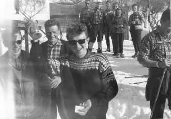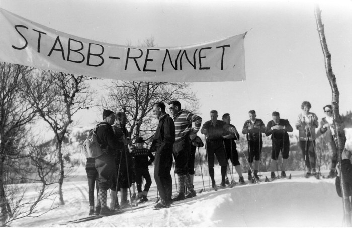 Publikumsbilde (med Stabb-rennet-seglet ): Antakelig også 1964. Her gjenkjennes Palmer Lilleløkken (med ryggsekk) og Arne Huseby stående imot han. Buketten med 4 stramme ungkarer fra Skoga: Joralf Grøset, Magne Lilleløkken, Lars Jon Haugen, Inge Grøseth. Kanskje karene kjenner damene ved sida?